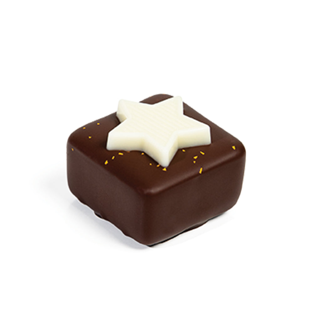 Coconut Gianduja covered in dark chocolate decorated with a white star.