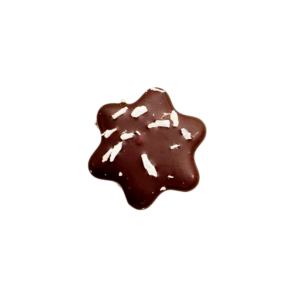 Coconut Gianduja covered in dark chocolate decorated with a white star.