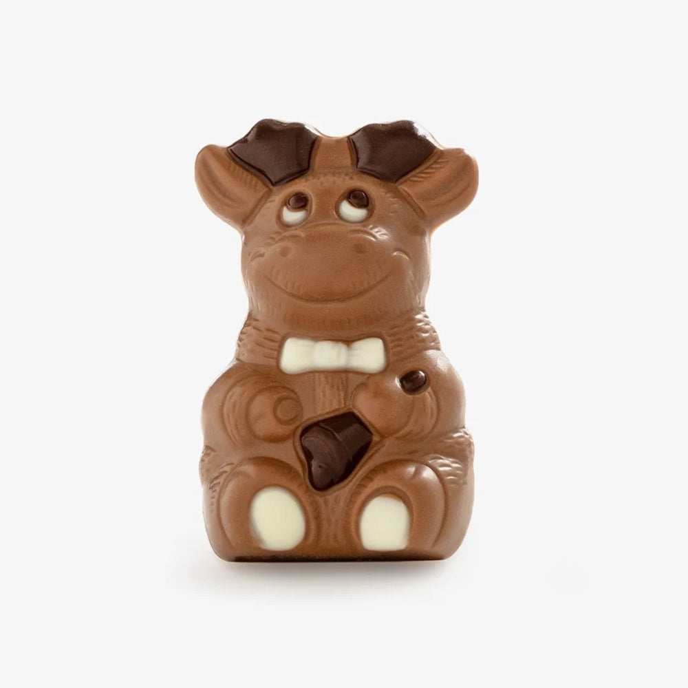 This little Läderach chocolate moose is the ideal gift for Christmas. Made from the finest hazelnut gianduja and covered in the best Swiss milk chocolate, decorative elements created from white and dark chocolates add delightful accents. The moose would also make an adorable Christmas tree ornament thanks to the hanging ribbon.
