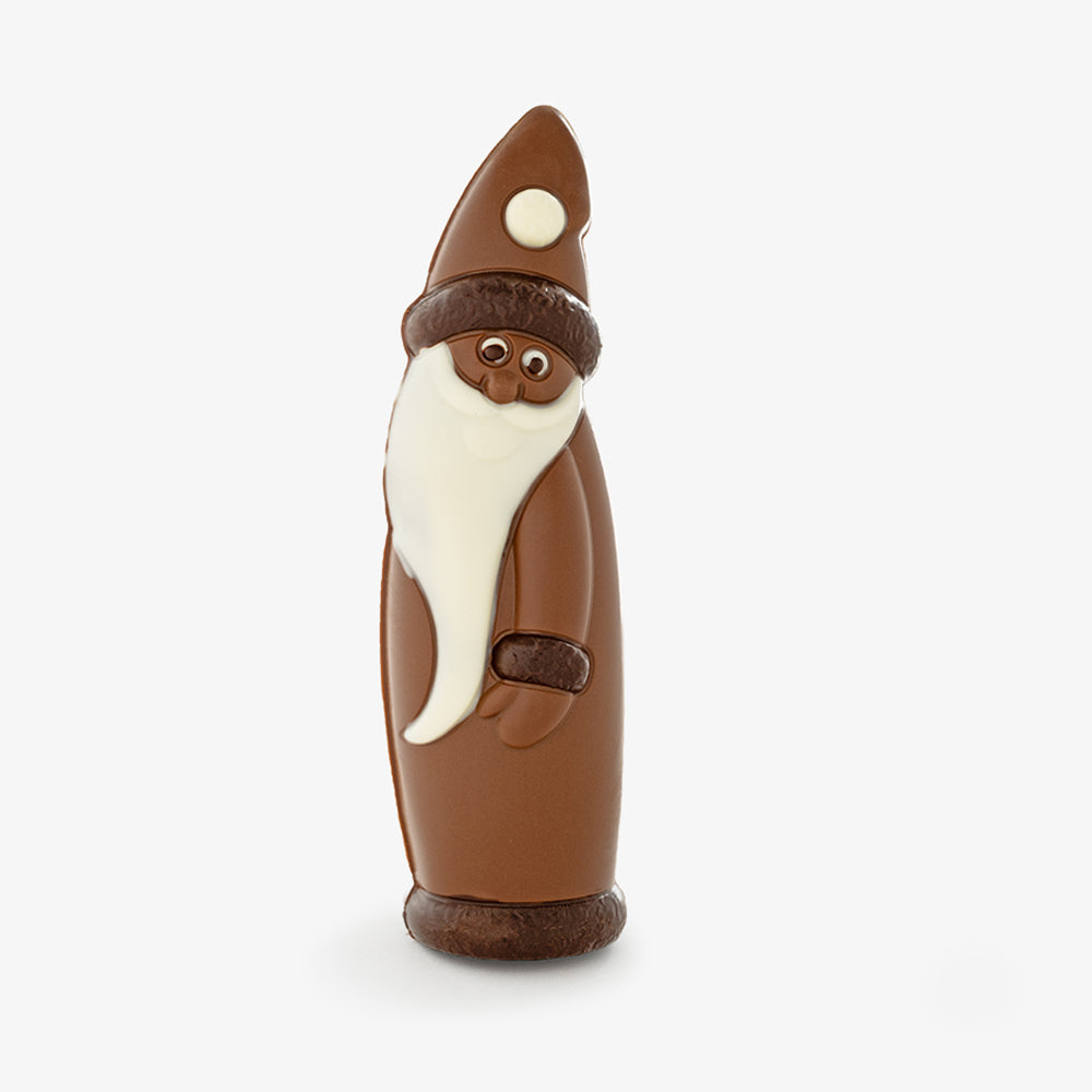 The Santa, made of heavenly fragrant milk chocolate, is one of the absolute highlights of our Christmas chocolate factory. His particularly long beard is crafted from white chocolate. The brim of the Santa hat and the cuffs on the coat are trimmed with dark chocolate. A Santa good enough to eat – and too beautiful to be hidden under foil.
